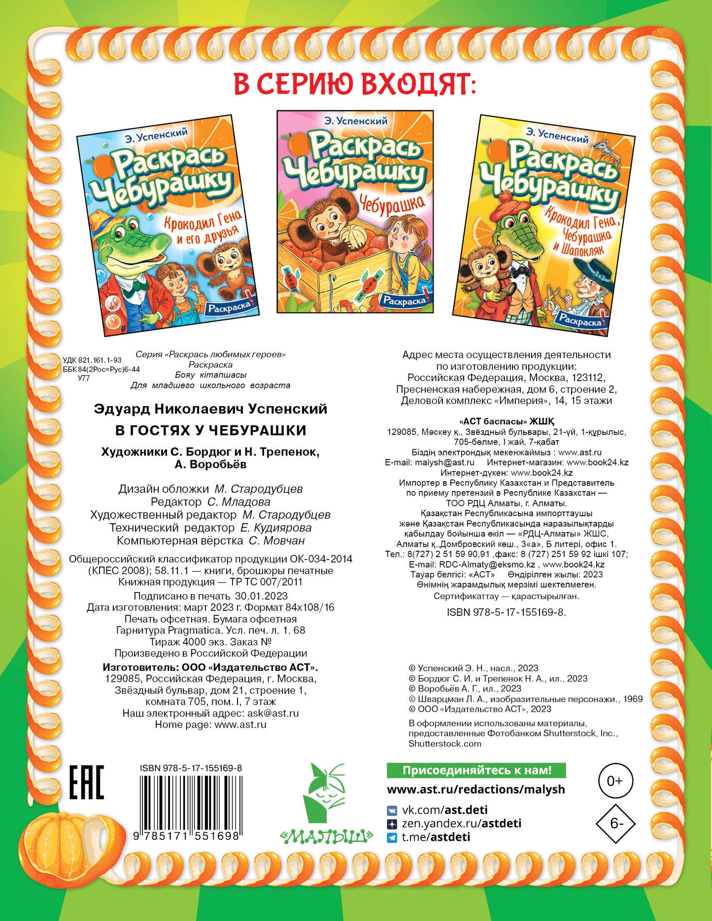 В раскраске «В гостях у Чебурашки» дети познакомятся с «неизвестным науке зверем» Чебурашкой и его друзьями: крокодилом Геной, жирафой Анютой, девочкой Галей, а также с беспокойной бабушкой Шапокляк и её подружкой ручной крысой. Раскрашивать Чебурашку и его друзей можно карандашами и фломастерами.