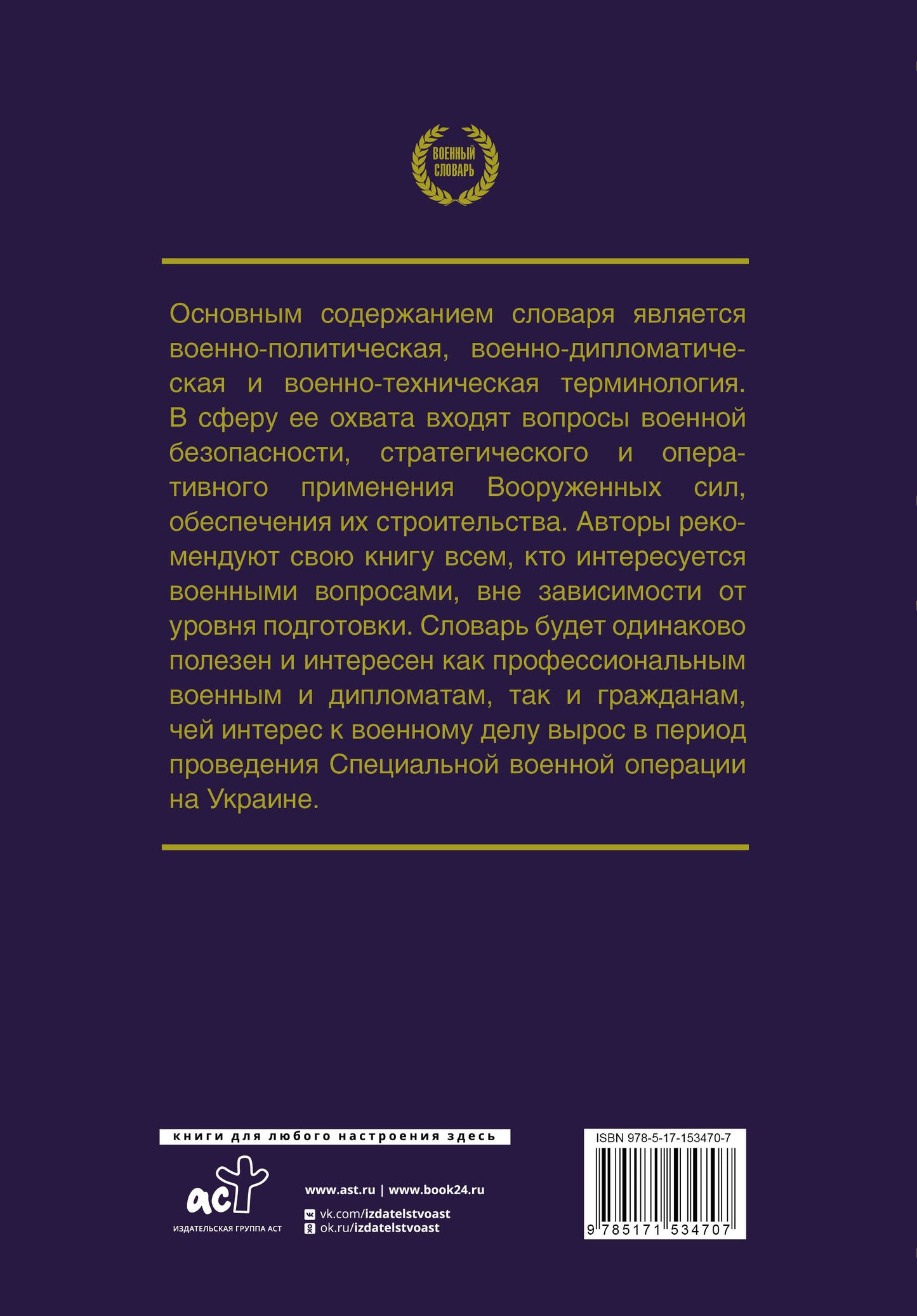 Основным содержанием словаря является военно-политическая, военно-дипломатическая и военно-техническая терминология. В сферу ее охвата входят вопросы военной безопасности, стратегического и оперативного применения Вооруженных сил, обеспечения их строительства. Словарь будет одинаково полезен и интересен как профессиональным военным и дипломатам, так и гражданам, чей интерес к военному делу вырос в период проведения Специальной военной операции на Украине.