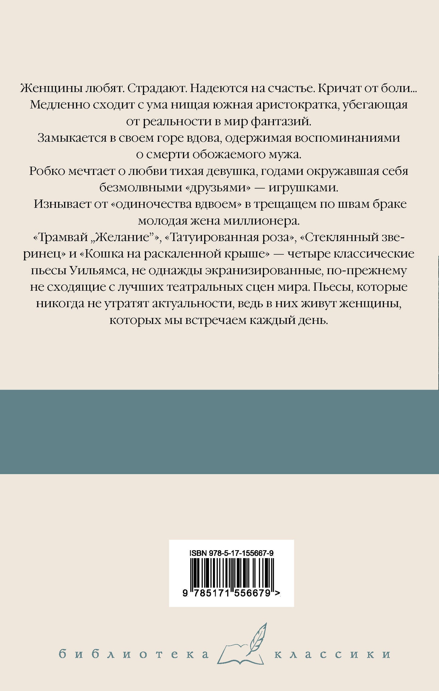 Четыре культовые пьесы Теннесси Уильямса, одного из самых знаменитых драматургов XX века, двукратного обладателя Пулитцеровской премии, под одной обложкой. Все пьесы, вошедшие в сборник, по сей день не сходят с театральных подмостков, а экранизация «Трамвая “Желание”» в свое время завоевала четыре премии «Оскар».